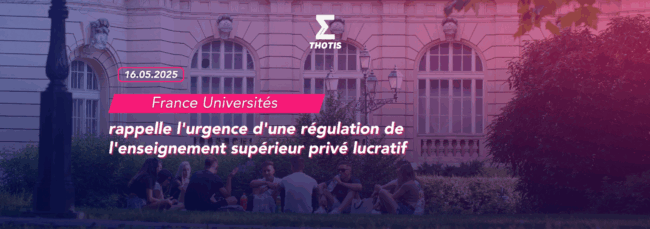 Dans un communiqué publié vendredi 16 mai 2025, France Universités tient à rappeler solennellement la nécessité d’un contrôle et d’une régulation pour identifier et prévenir les dérives de l’enseignement supérieur privé à but lucratif. À lire également, sur Thotis : Les priorités stratégiques du nouveau Bureau de France Universités :  Vie étudiante, régulation du privé,…