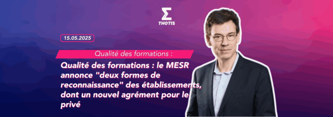 Le MESR redéfinit la reconnaissance des établissements en deux catégories, créant un agrément spécifique pour le privé.  « Nous aurons deux formes de reconnaissance » des établissements d’enseignement supérieur : l’une pour ceux « qui participent pleinement au service public de l’enseignement supérieur » et une autre pour « des établissements agréés », indique Philippe Baptiste le 13 mai 2025 lors…