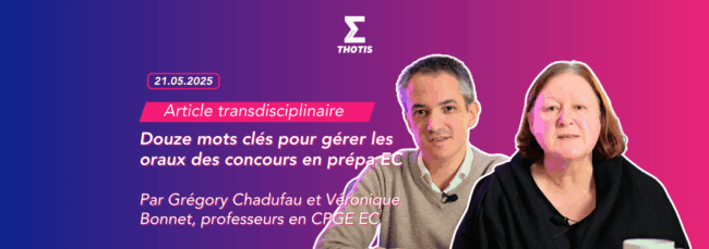 Article transdisciplinaire de Véronique Bonnet, professeur de philosophie-culture générale, et Grégory Chadufau, professeur de mathématiques, en classes préparatoires aux grandes écoles (CPGE), filière EC (la filière qui conduit aux grandes écoles de management), au lycée Janson de Sailly à Paris. Douze mots clés pour gérer les oraux des concours en prépa EC. Performances en vue.…
