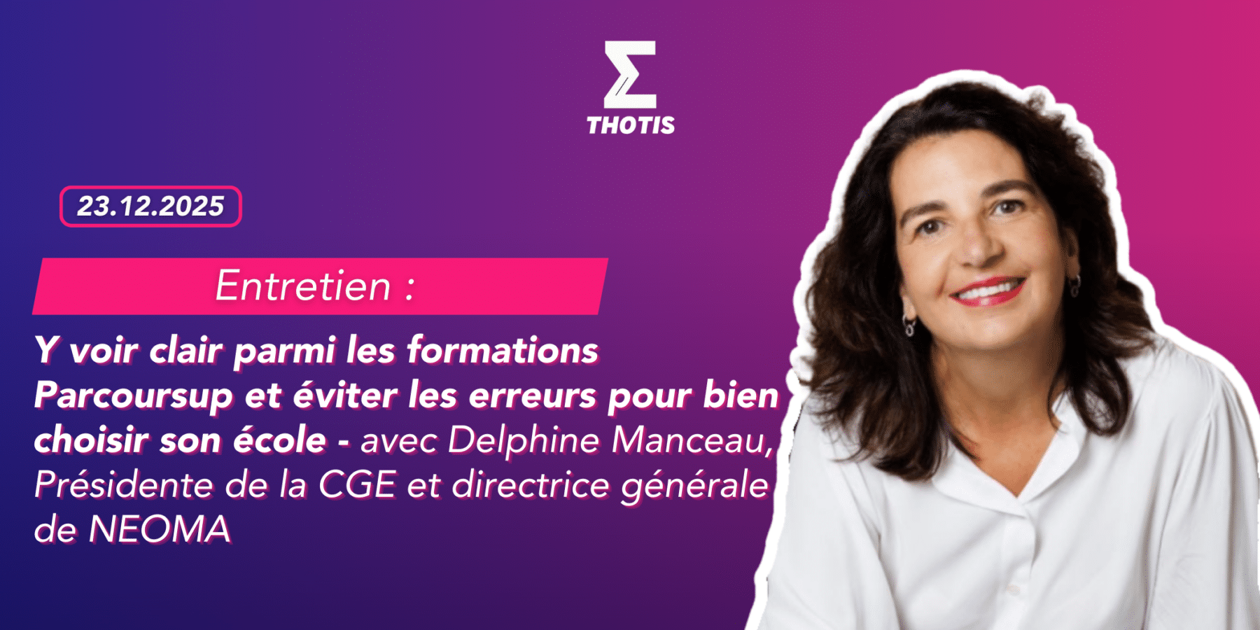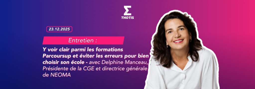 Dans un entretien pour Thotis, Delphine Manceau, Présidente de la CGE (Conférence des Grandes Écoles) et directrice générale de NEOMA, partage ses conseils experts pour accompagner les familles et les jeunes dans leur projet d’orientation et en éviter les pièges.