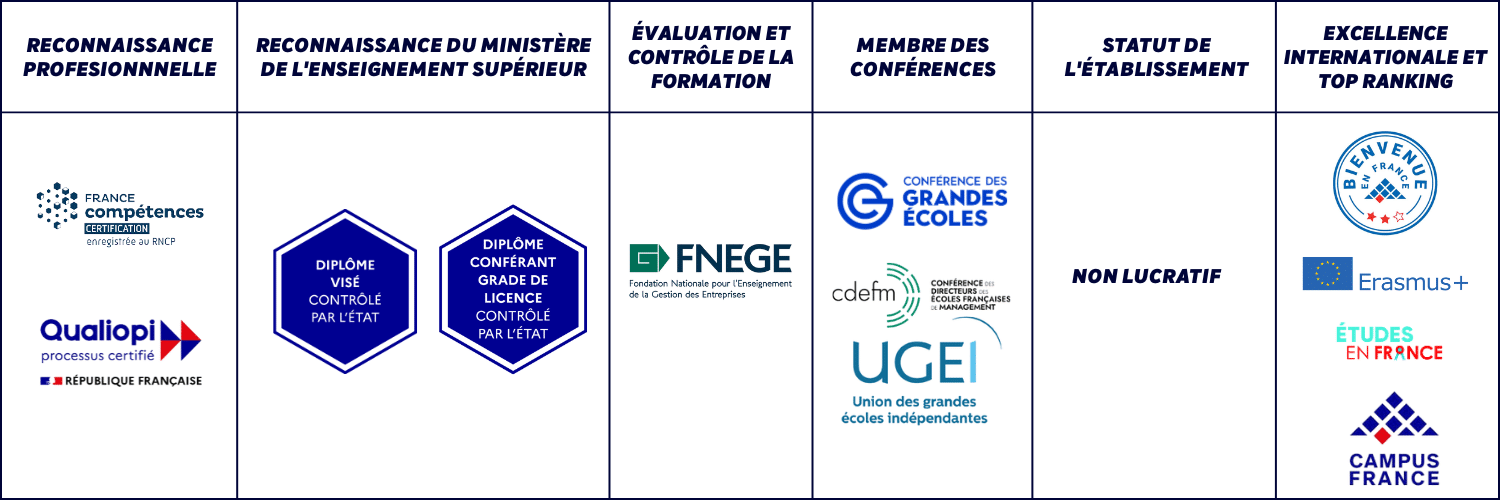L’école délivre des diplômes reconnus par l’État : Grade de Licence, Diplôme Bac+5 visé et titres RNCP (niveaux 6 et 7), labellisés par la CGE.