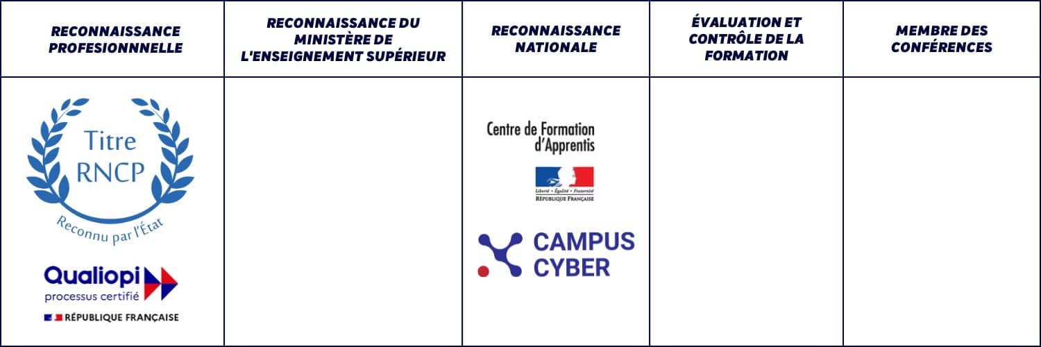Les formations sont reconnues par l’État et certifiées (titres RNCP de niveau 6 et 7, Qualiopi, statut CFA), garantissant leur qualité et leur conformité aux standards nationaux de l’enseignement supérieur. L’école est Certificateur, assurant la qualité pédagogique de plus d’une dizaine d’écoles informatiques en France.