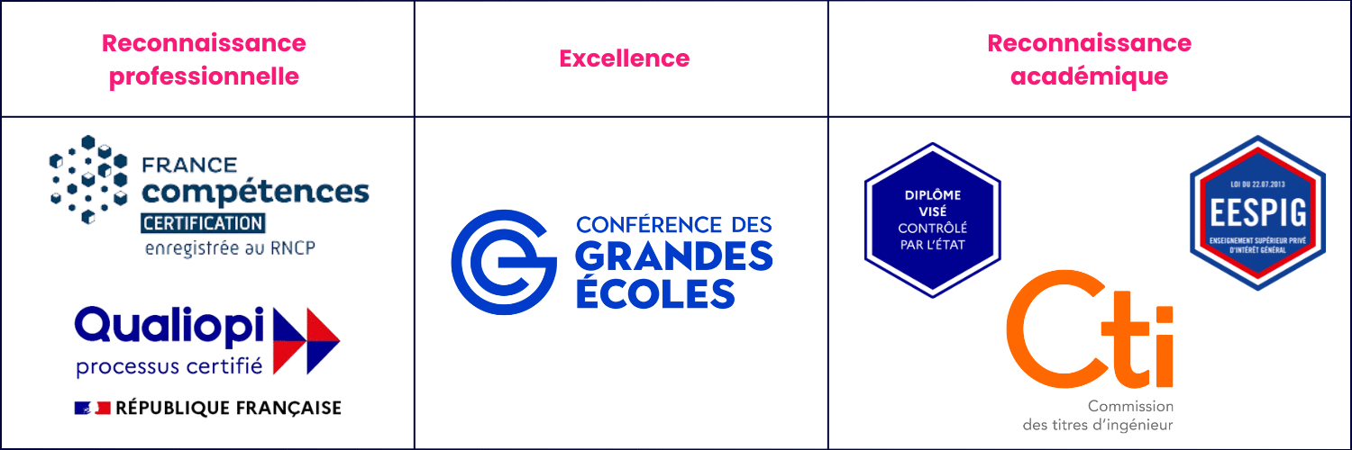 C’est une école labellisée EESPIG (Établissement d’enseignement supérieur privé d’intérêt général), membre de la conférence des Grandes Écoles, qui vous délivre un diplôme d’ingénieur par la CTI (Commission des Titres d’Ingénieur).