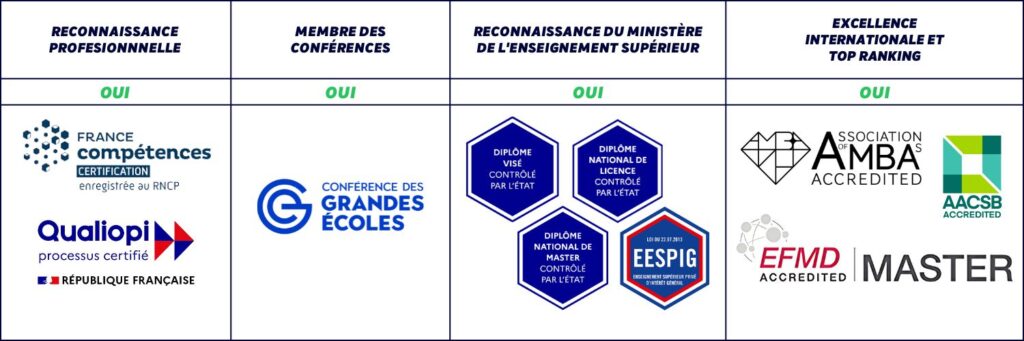 Implantée à Bordeaux, Marseille, Paris et Toulon + à l’international (Abidjan, Dakar, Mumbai, Shanghai et Suzhou), l’école délivre des diplômes reconnus par l’État : Grade de Licence, Grade de Master, diplômes visés et titres RNCP (niveaux 6 et 7), et bénéficie de la triple accréditation internationale : AACSB, EQUIS et AMBA.