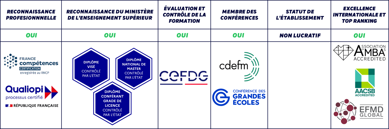 Paris School of Business est une école de management reconnue au niveau national et international. Membre de la Conférence des Grandes Écoles et titulaire de plusieurs accréditations internationales prestigieuses (AACSB, AMBA, EFMD Master, BGA), l’école délivre des diplômes reconnus par l’État.